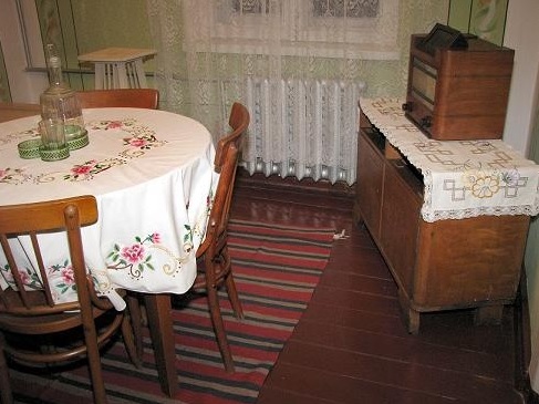 In the sitting room, a characteristic table for potted flower and a radio-set are put close to the window. The realistic impression is strengthened by the carafe with a tray, the guitar on a sofa, textile handicrafts. A portable kerosene stove marks the place of the former tiled stove, which gave out its warmth to the poet's home in Kalniškiai (see Fig. 7).